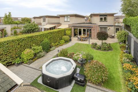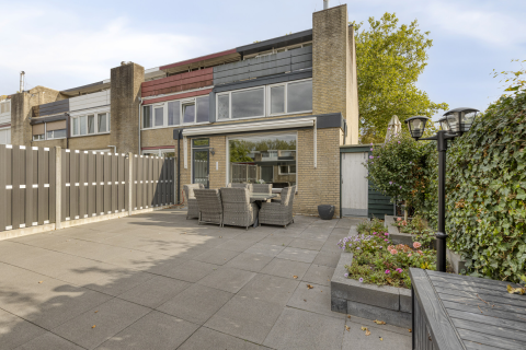 De achtertuin is een echte gezinstuin. Met een oppervlakte van ruim 151 m² en een ligging op het zuidoosten is dit een plek waar iedereen zijn draai kan vinden. Er zijn meerdere terrassen, een gazon en borders met boompjes. Terwijl de kinderen spelen op het gras, geniet je zelf van de zon of juist van een schaduwplekje. Achterin staat een grote houten berging van 6,50 bij 2,76 meter, voorzien van elektra en een handige zolder. Ideaal voor fietsen, speelgoed of tuinspullen. Via de achterom bereik je gemakkelijk de brandgang, zodat je altijd snel met de fiets weg kunt.