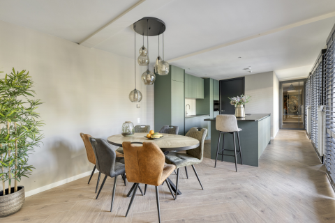 De keuken sluit direct aan en is een fijne plek om samen te koken. Je vindt er een apparatenwand met onder andere een magnetron en inbouwkoffiezetapparaat. Het L-vormige keukenblok is uitgerust met een koelkast, diepvries, vaatwasser, spoelbak, vijfpits gasfornuis en afzuigkap. Dankzij de lades, kasten en bovenkastjes is er volop opbergruimte – ideaal voor een druk gezin. De keuken is ca. 4,26 meter lang en 2,58 meter breed.